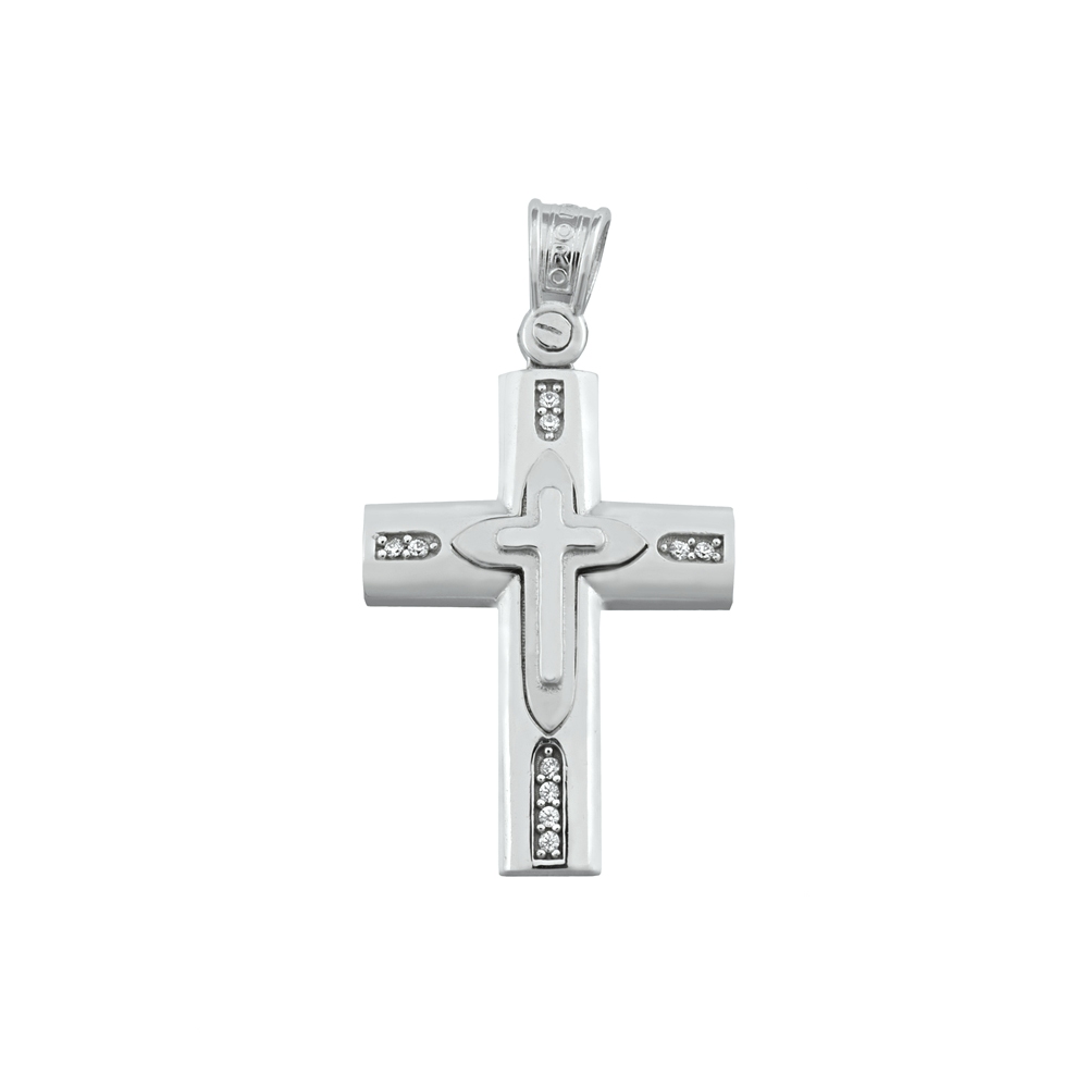 This sleek and simple cross is fashioned of 14k Solid Yellow and White Solid Gold Cross Pendant for Polished with 10 round white cz
