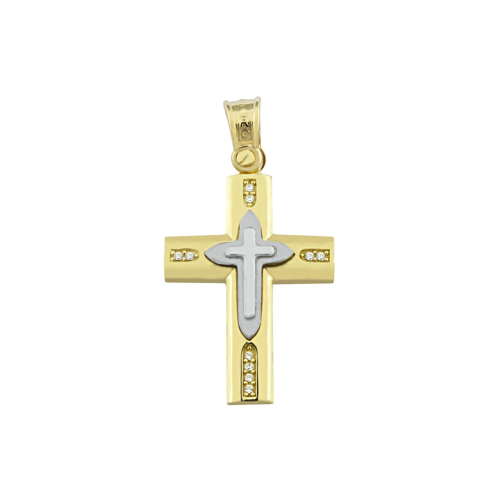 Greek Jewelry, A Yellow and White Gold Baptism Cross pendant that is perfect for adults and babies.