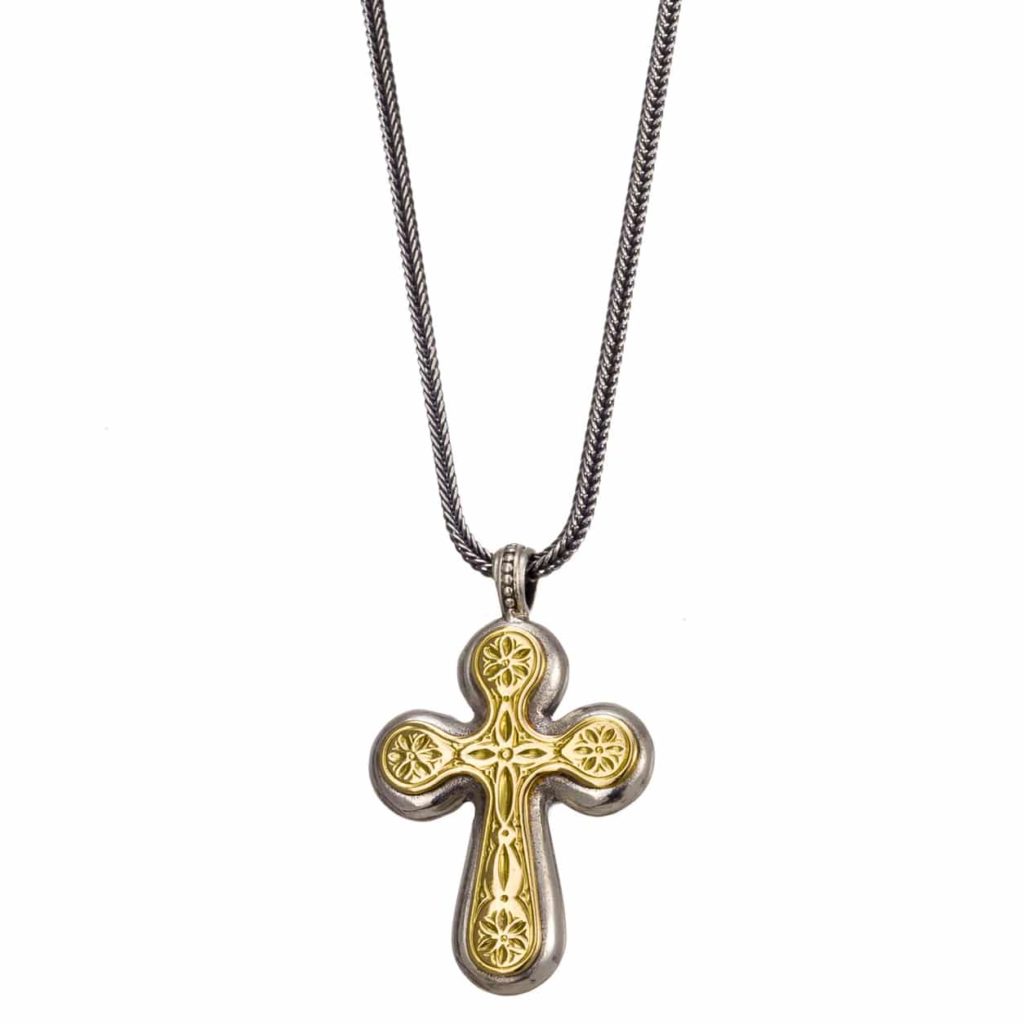 Greek Jewelry, Byzantine Cross Pendant 18k Yellow Gold and Sterling Silver 925