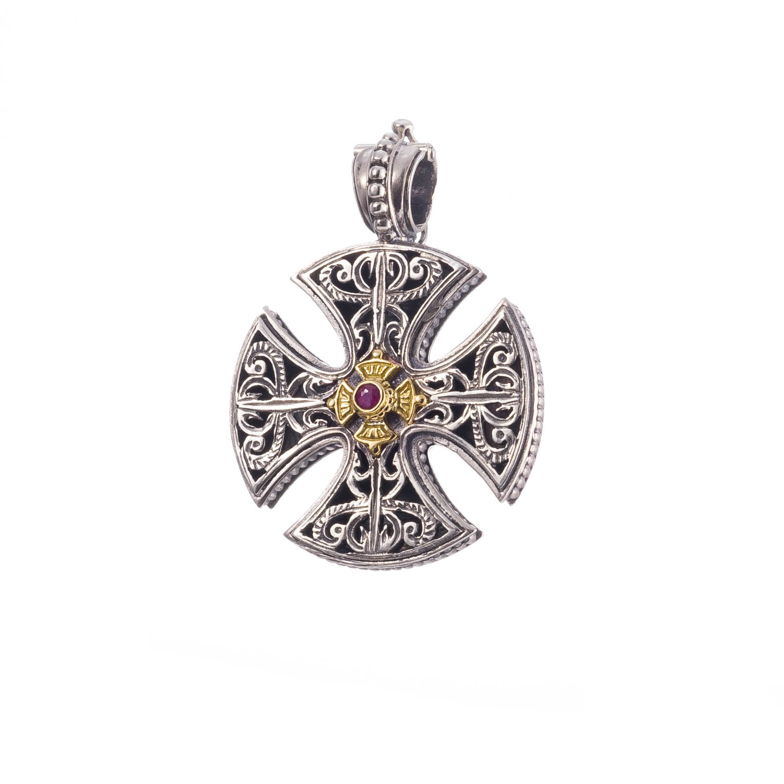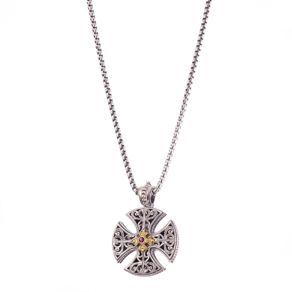 Greek Jewelry, Maltese Men’s Cross Pendant ruby 18k yellow gold and Sterling Silver 925