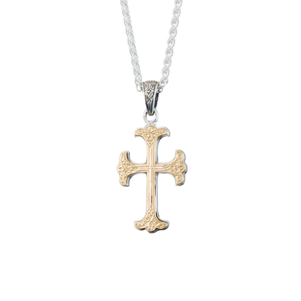 Greek Jewelry, Men’s Byzantine Cross Pendant 18k Yellow Gold and Sterling Silver 925