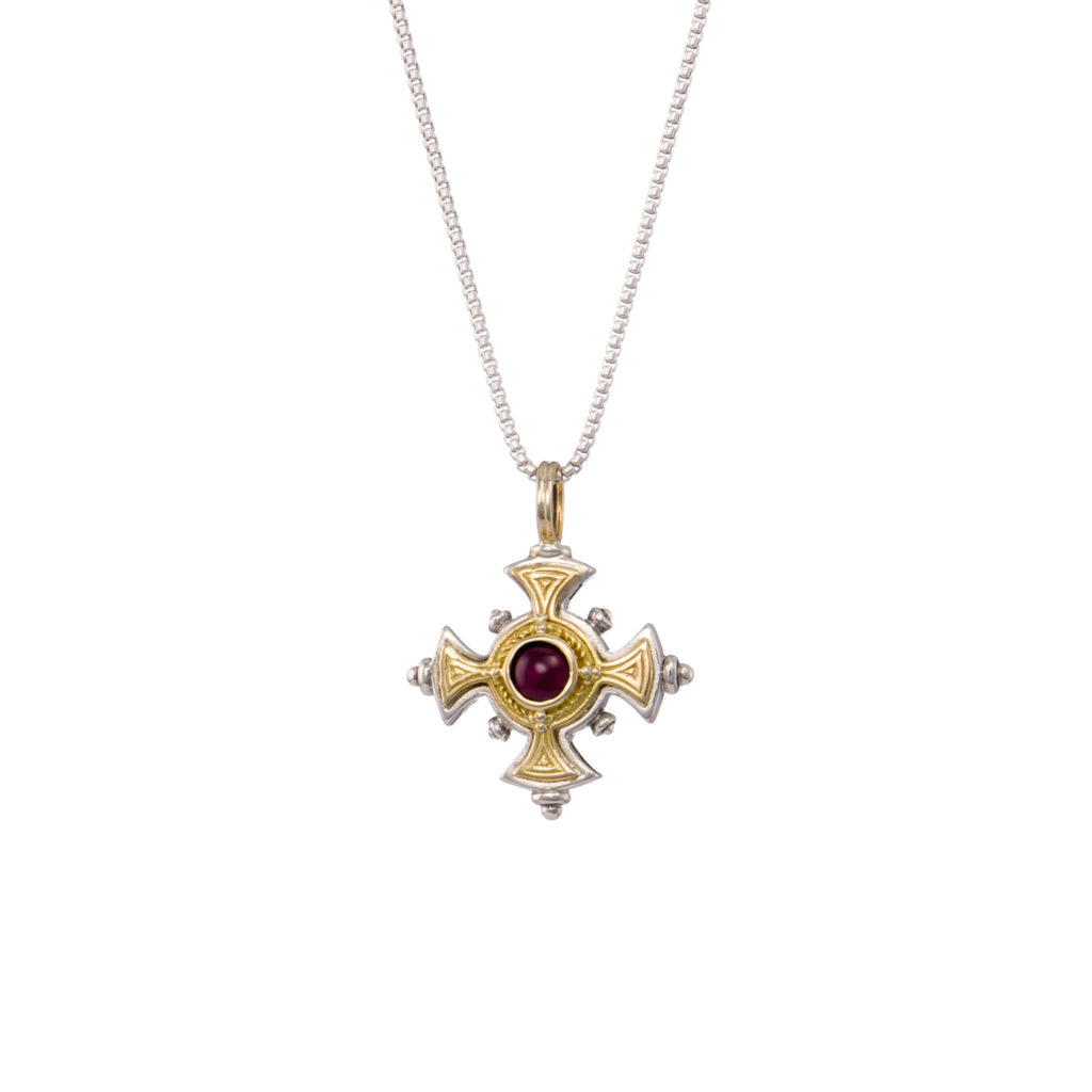 Byzantine Cross Pendant Garnet 18k Yellow Gold and Sterling Silver 925