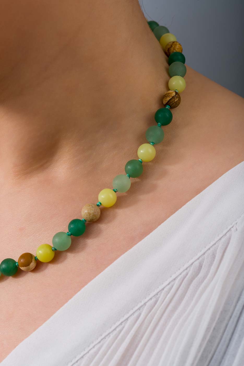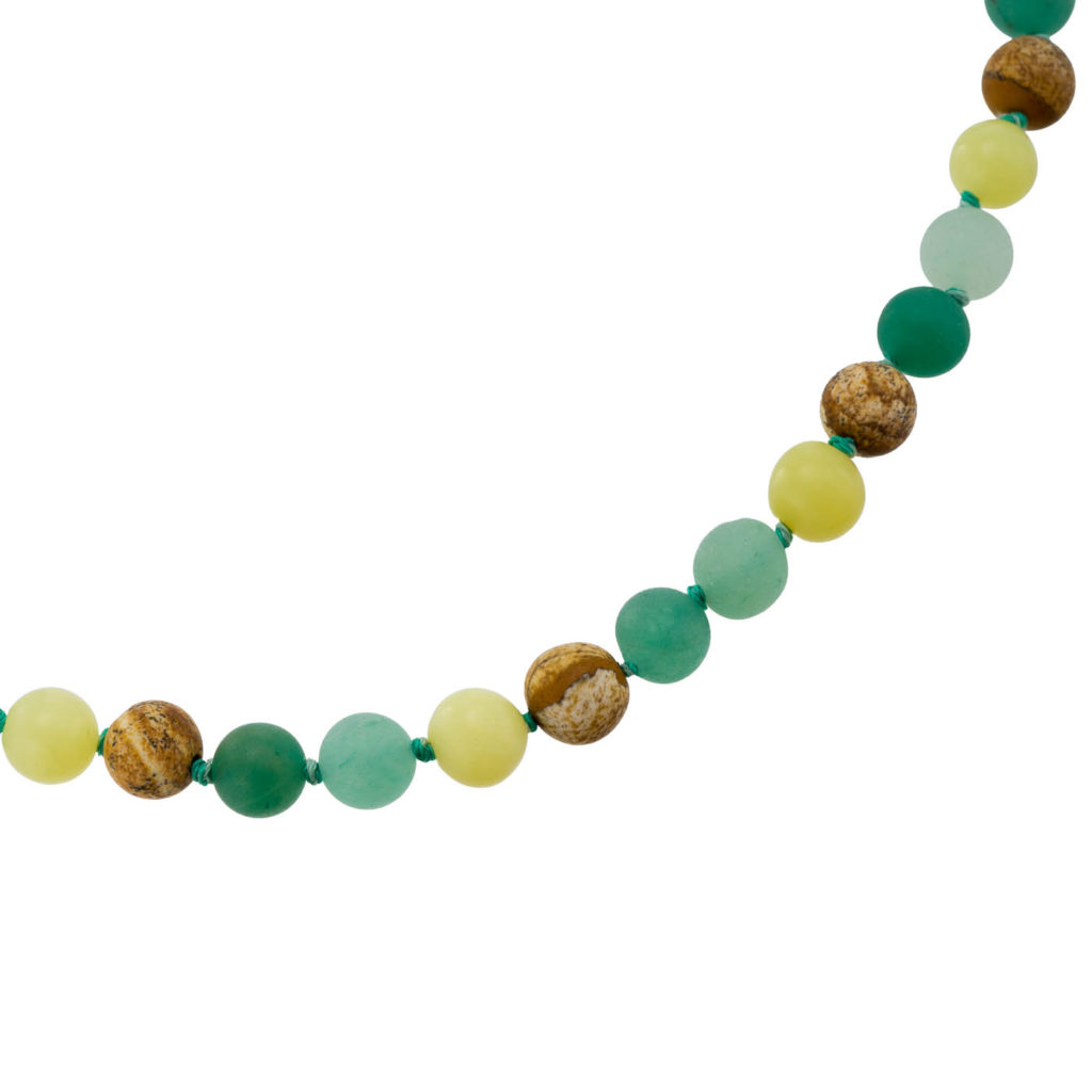 The 8mm Multi Stone Mat Beaded Necklace is a beautiful piece of jewelry that features a combination of different stones. The necklace is made of multi stone jasper, aventurine, amazonite, and jade mat beads, each measuring 8mm in size.