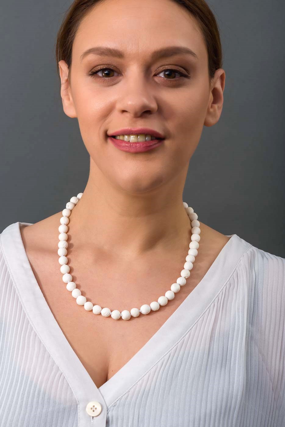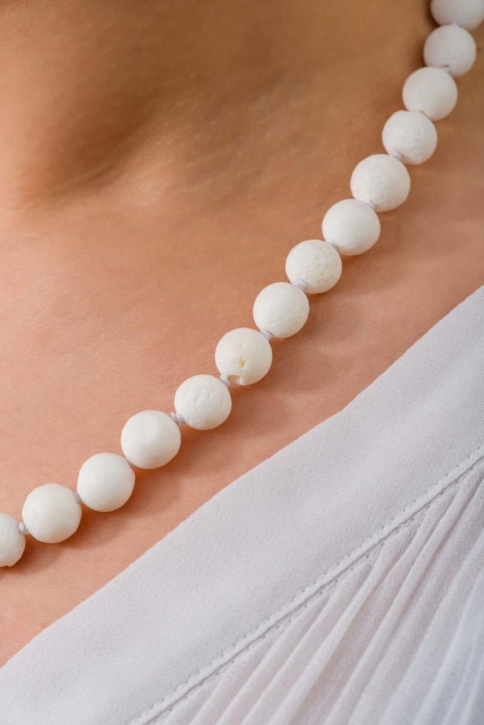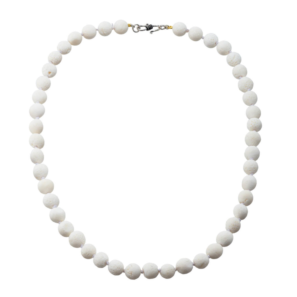 The necklace features rough, unpolished coral beads in a natural white color, which are strung together on a sturdy and durable cord.