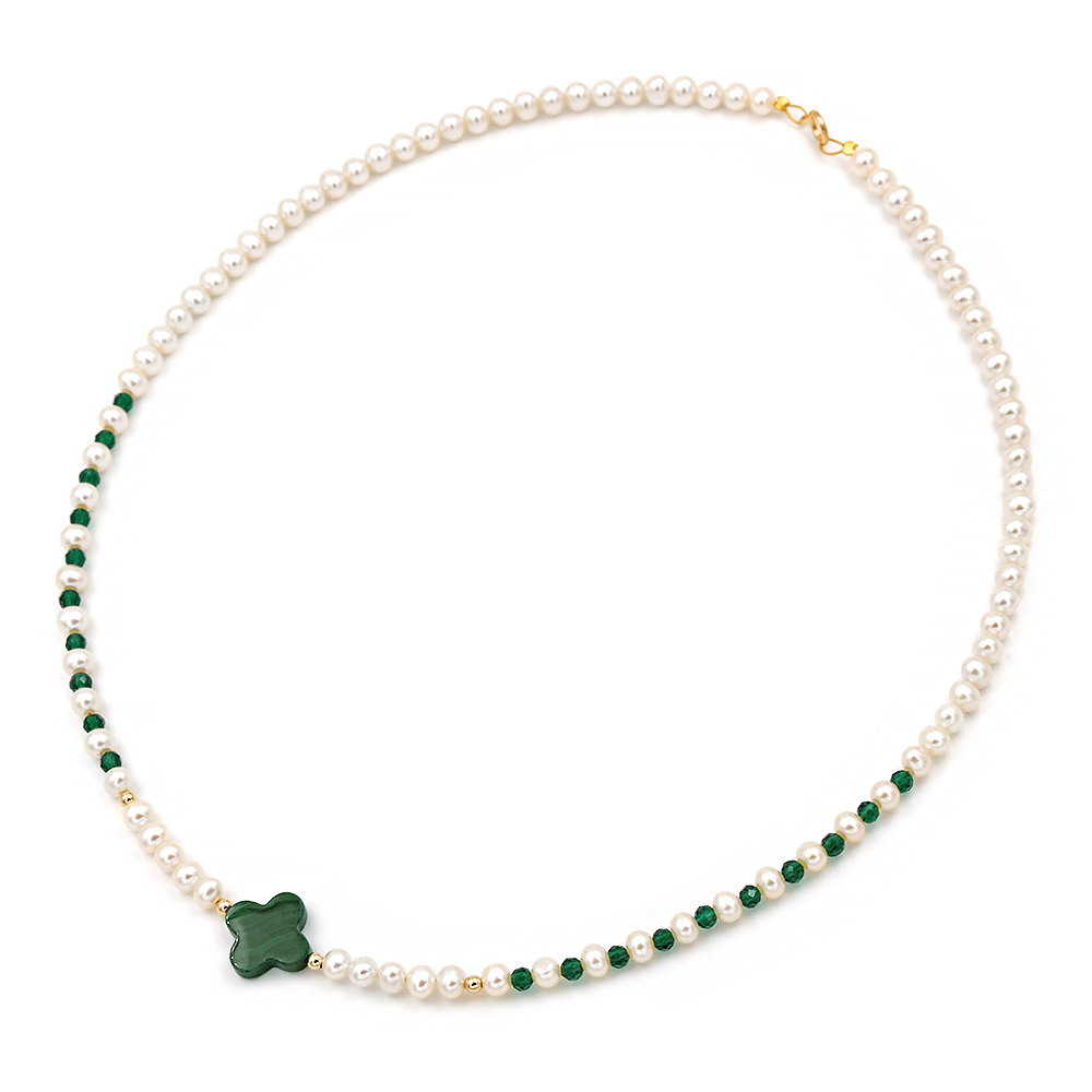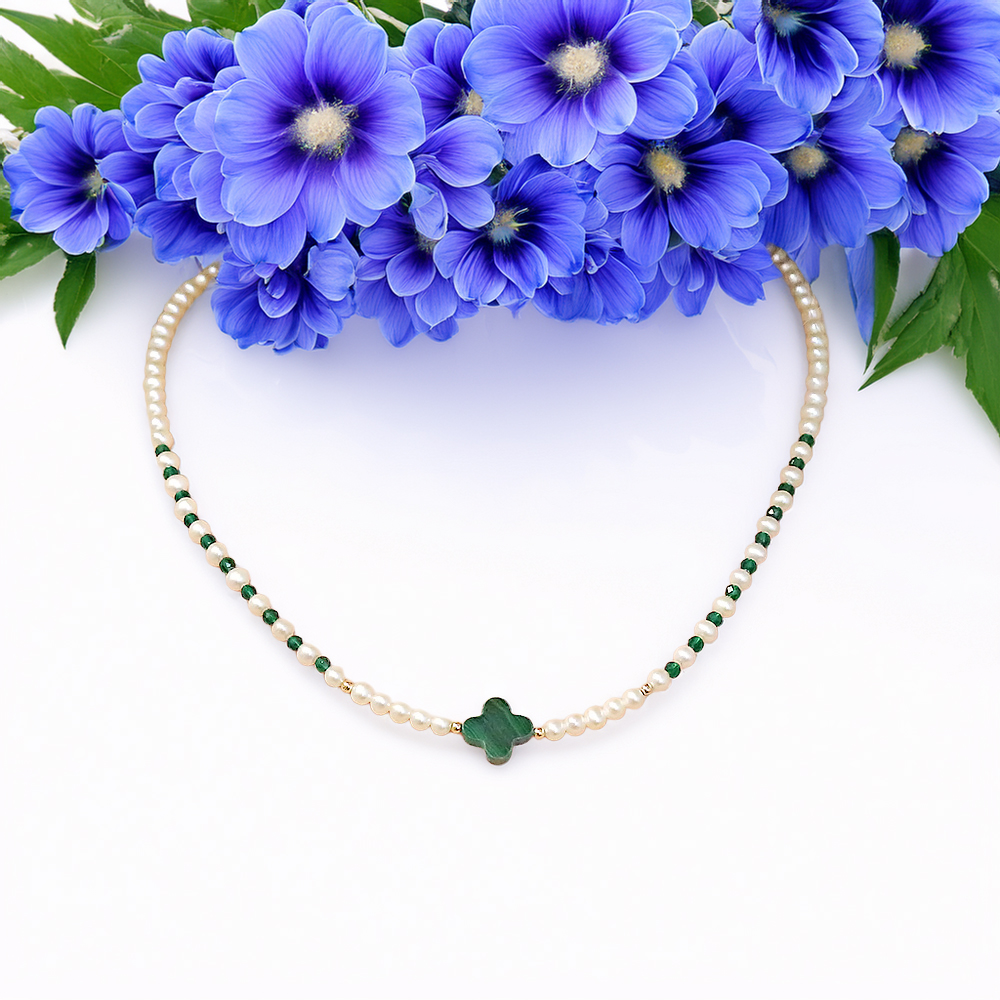 Necklace with white FreshWater Pearl diameter 4.0 to 4.5 mm in diameter, in a semi-round (rounded) shape and AAAA quality. The design features a malachite element, four 14k gold beads, and a polyhedral-cut spinel. It is finished with a 14k safety clasp and strung on high-resistance yellow-colored steel wire. The total length is approximately 43-44 cm