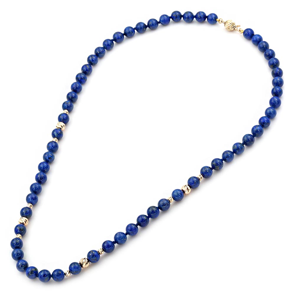 Necklace with 6.0 mm diameter Lapis. It has 12 gold elements with the diamond technique and a 14 carat double safety clasp. It is tied with knotted silk thread for protection and security. Its total length is 45 cm,