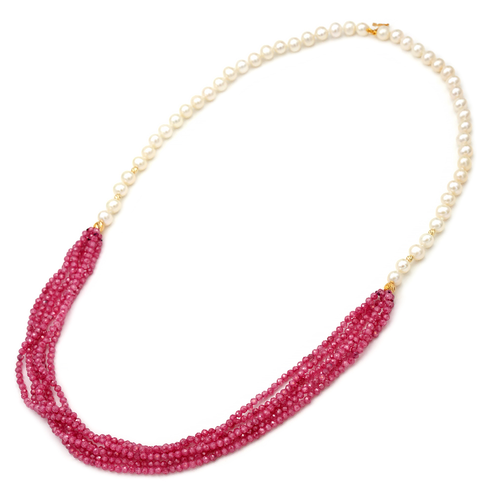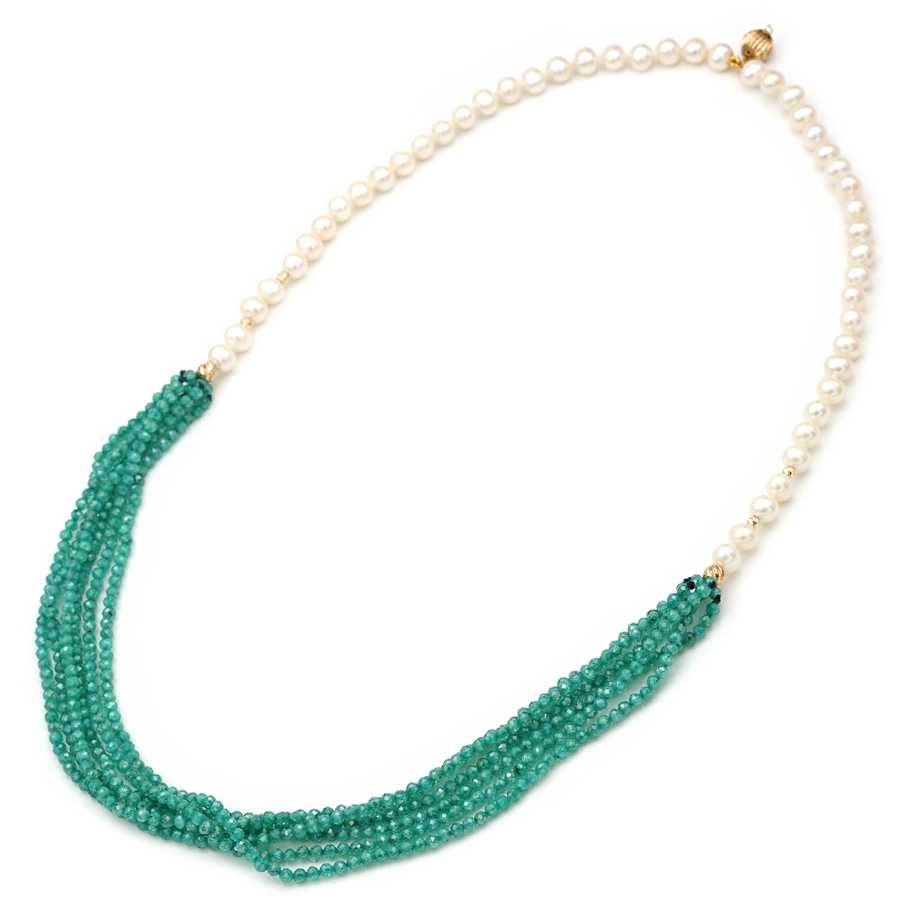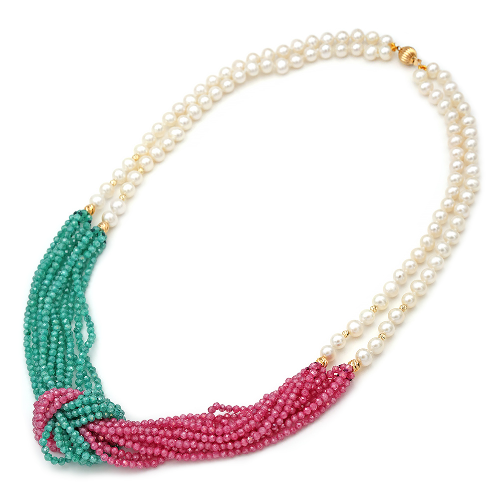 Necklace with 2 rows of white fresh water pearls Fresh Water Pearl diameter 6.0 – 6.5 mm in Round shape AAAA quality. In its center there are 6 rows of polyhedral cut agate in rouge coloring and 6 rows of polyhedral cut agate in mint coloring. The necklace can be untied and each row can be worn individually. It also features 12 14k gold elements with the diamond technique and a 14k gold double safety clasp. It is tied with silk thread that creates knots between the pearls for protection and security. The total length with the 2 necklaces tied is 55 cm while individually they are 62 cm each to go over the head in one piece. But you can order it in any length you want.