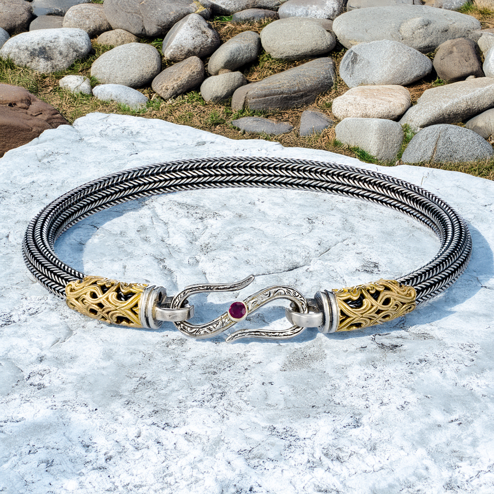 Greek Jewelry, Elegant Bracelet for Men Braided Handmade Chain 925 Silver and 18k Gold