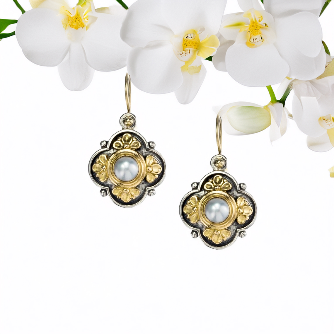 Greek Jewelry, Byzantine Flower Earrings for Women’s Yellow Gold k18 and Sterling Silver 925