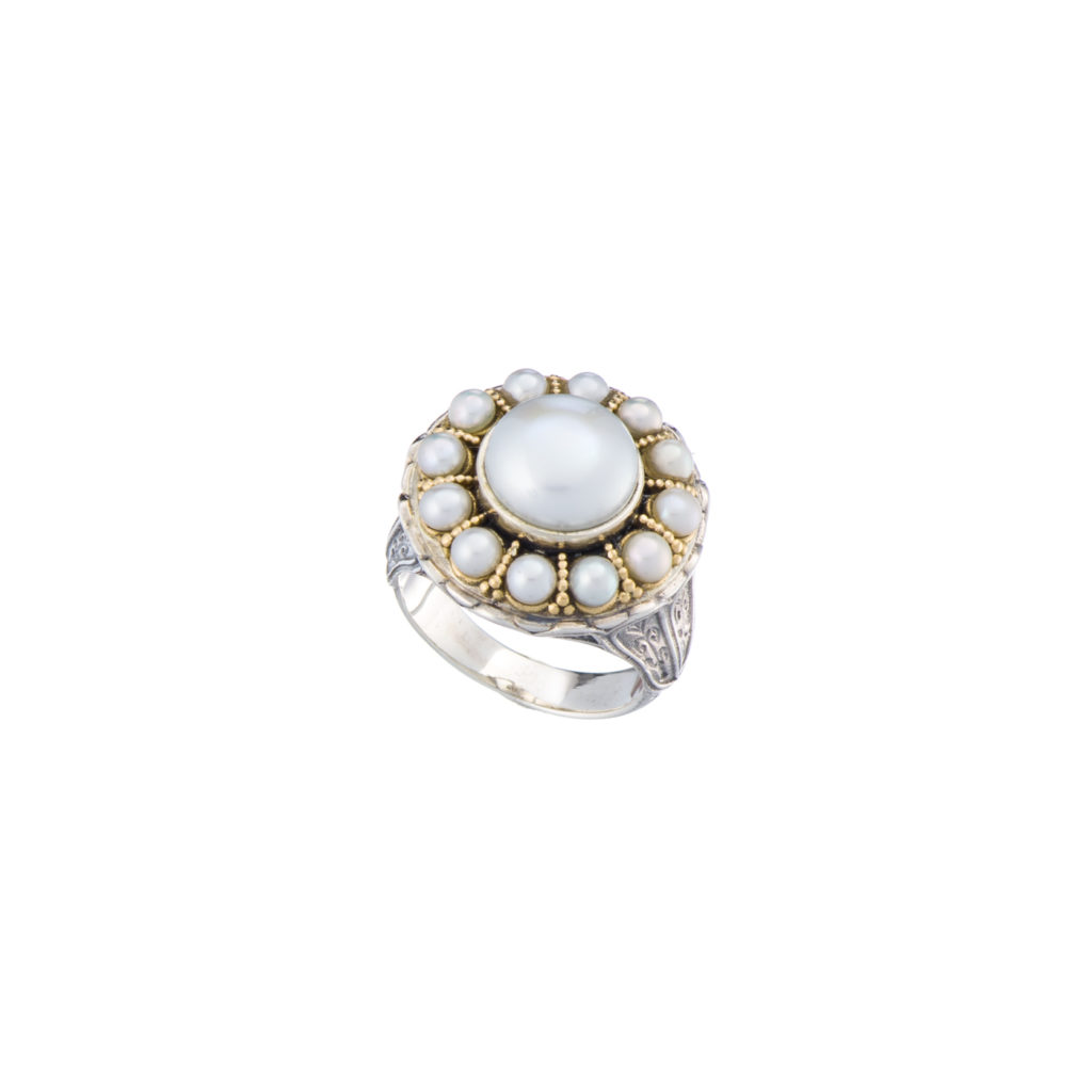 Greek Jewelry, Pearls Byzantine Round Ring 18k Yellow Gold and Sterling Silver 925 with thirteen freshwater pearls.