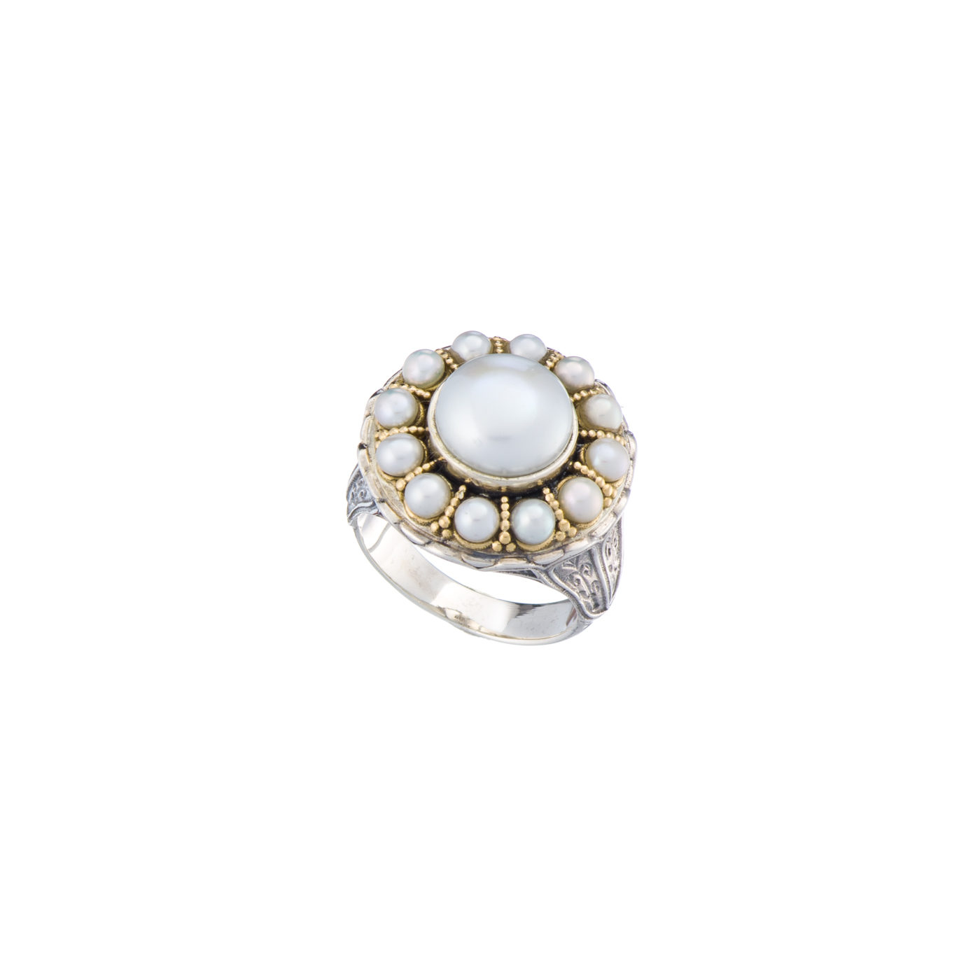 Pearls Byzantine Round Ring 18k Yellow Gold and Sterling Silver 925