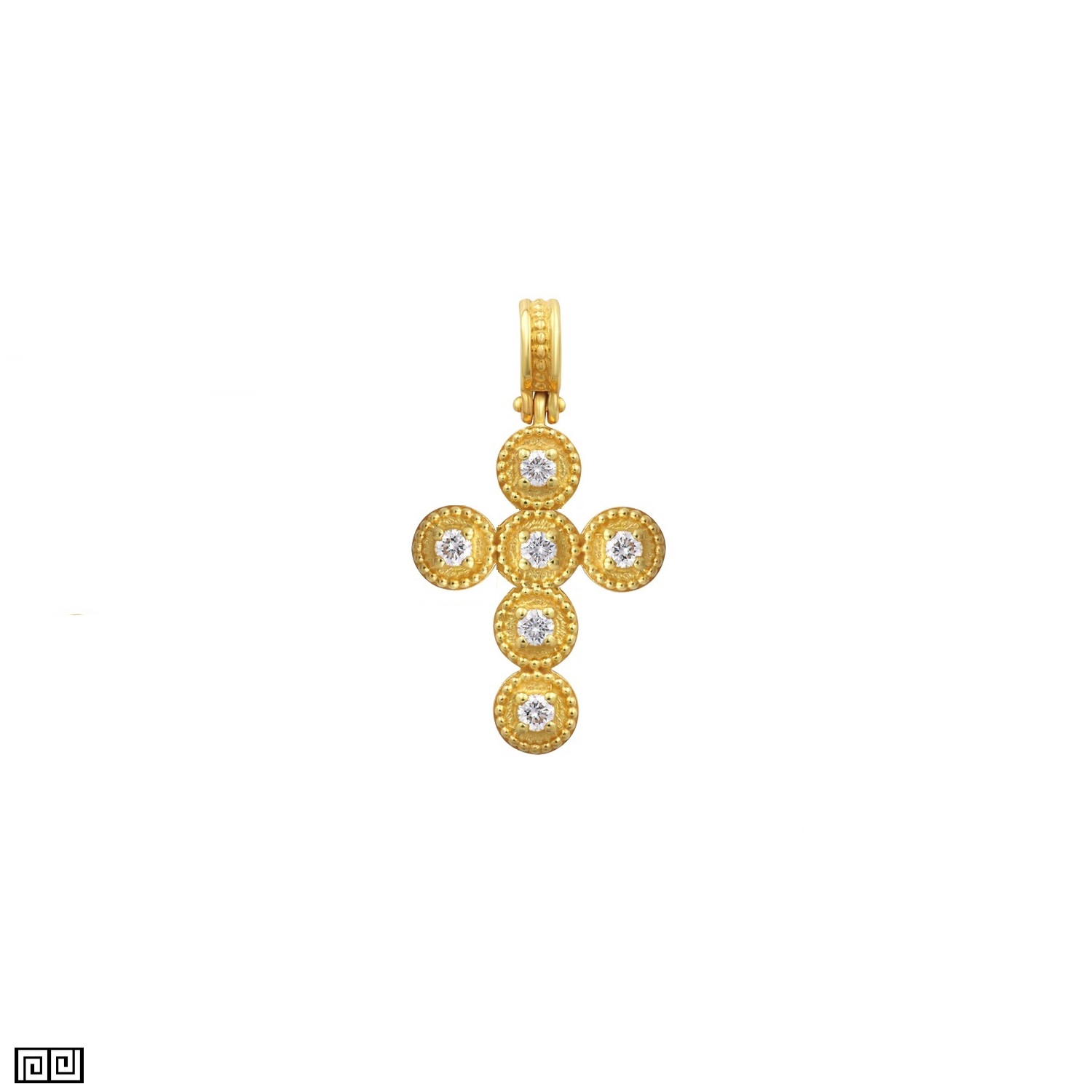Greek Jewelry, this classic religious byzantine cross design pendant complimented set round diamonds is hand crafted and cast in solid 18k yellow gold, diamonds