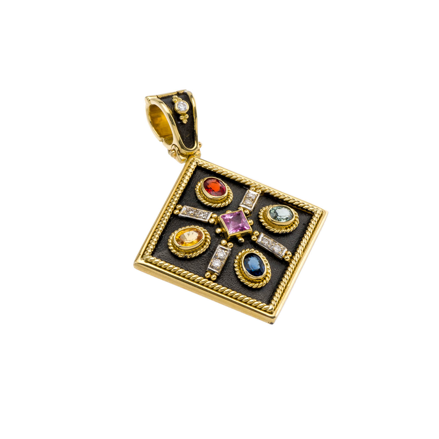 Greek Jewelry, 18k Gold square pendant with multi colors sapphires