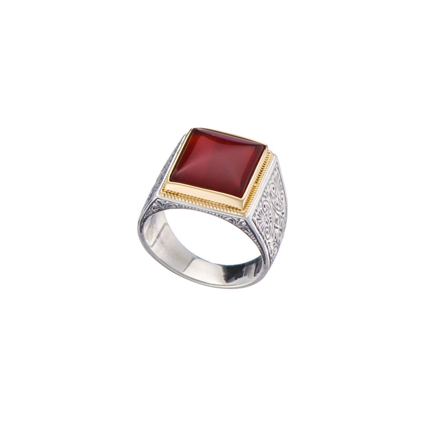 Engraved Ring for Men in 18k Yellow Gold and Silver with Semi Precious Stones