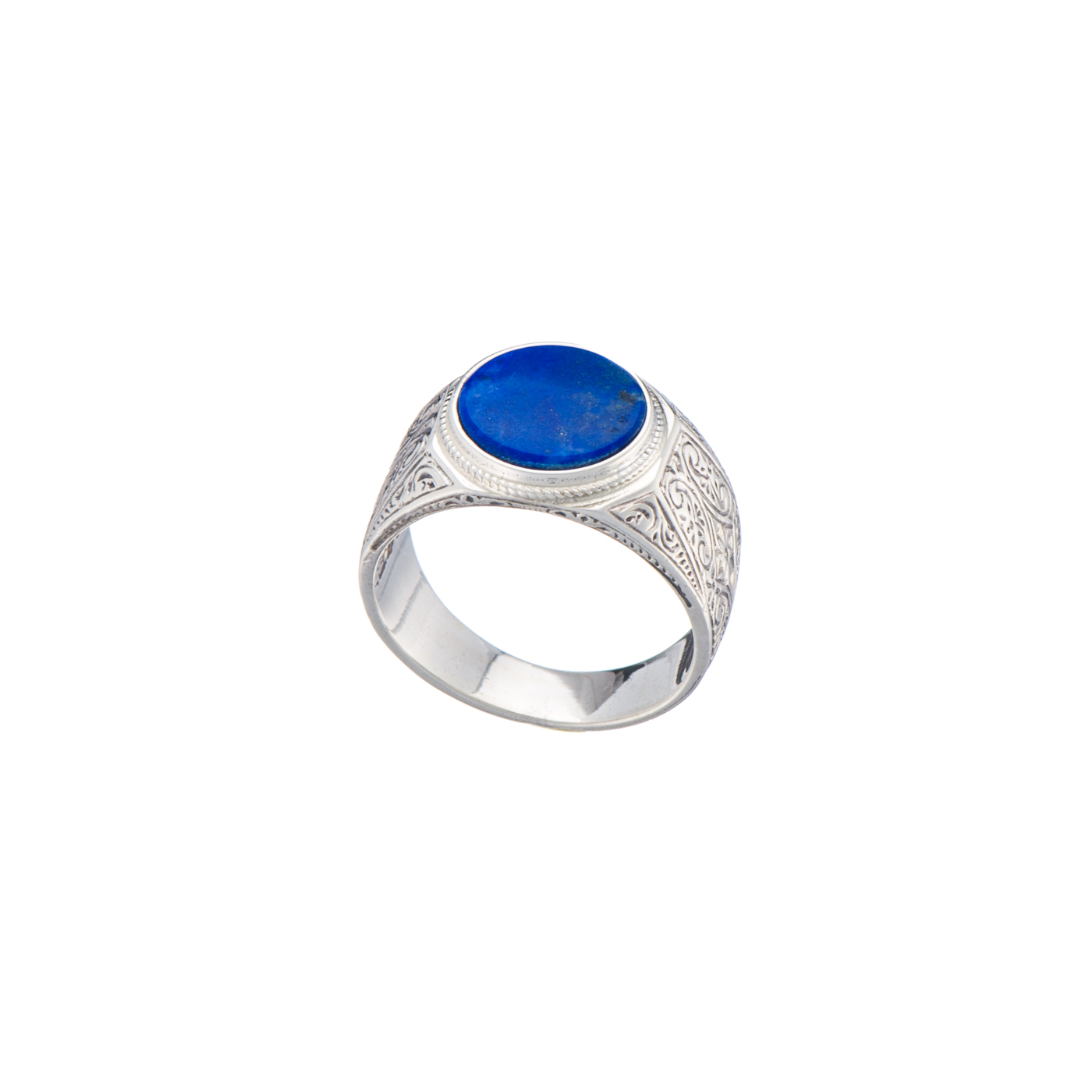Round Engraved Silver Ring for Men with Semi Precious Stones