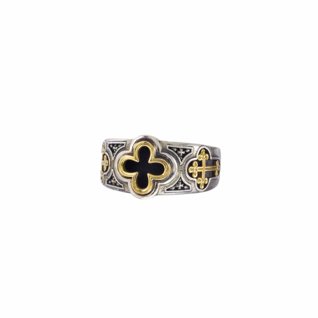 Greek Jewelry, Triple Cross Men’s Band Byzantine Ring 18k Yellow Gold and Sterling Silver 925