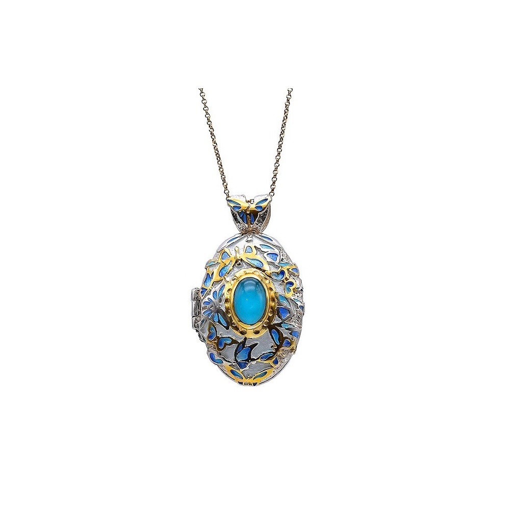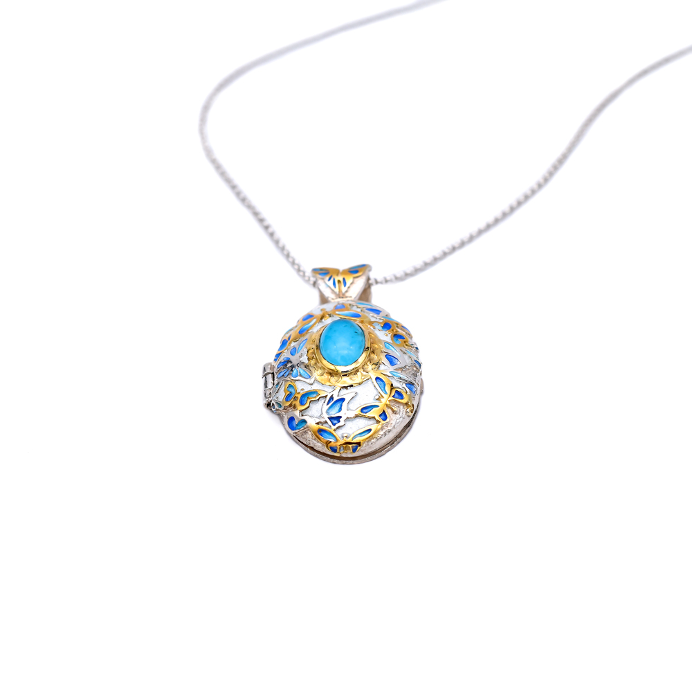 Butterfly Locket Pendant with Turquoise Gemstone and Enamel
