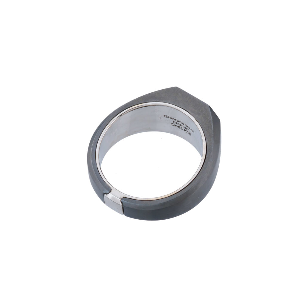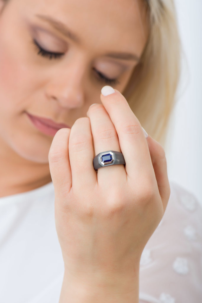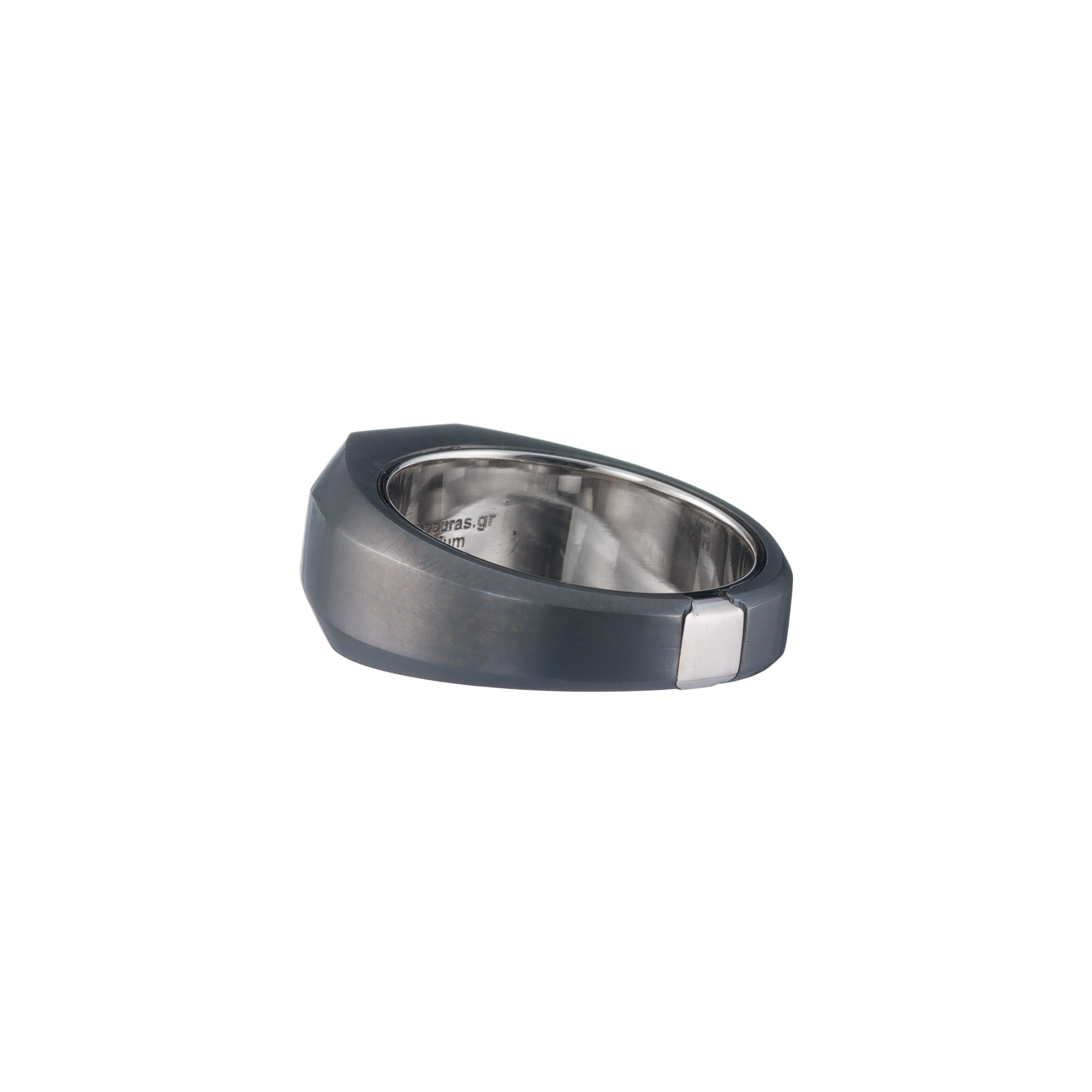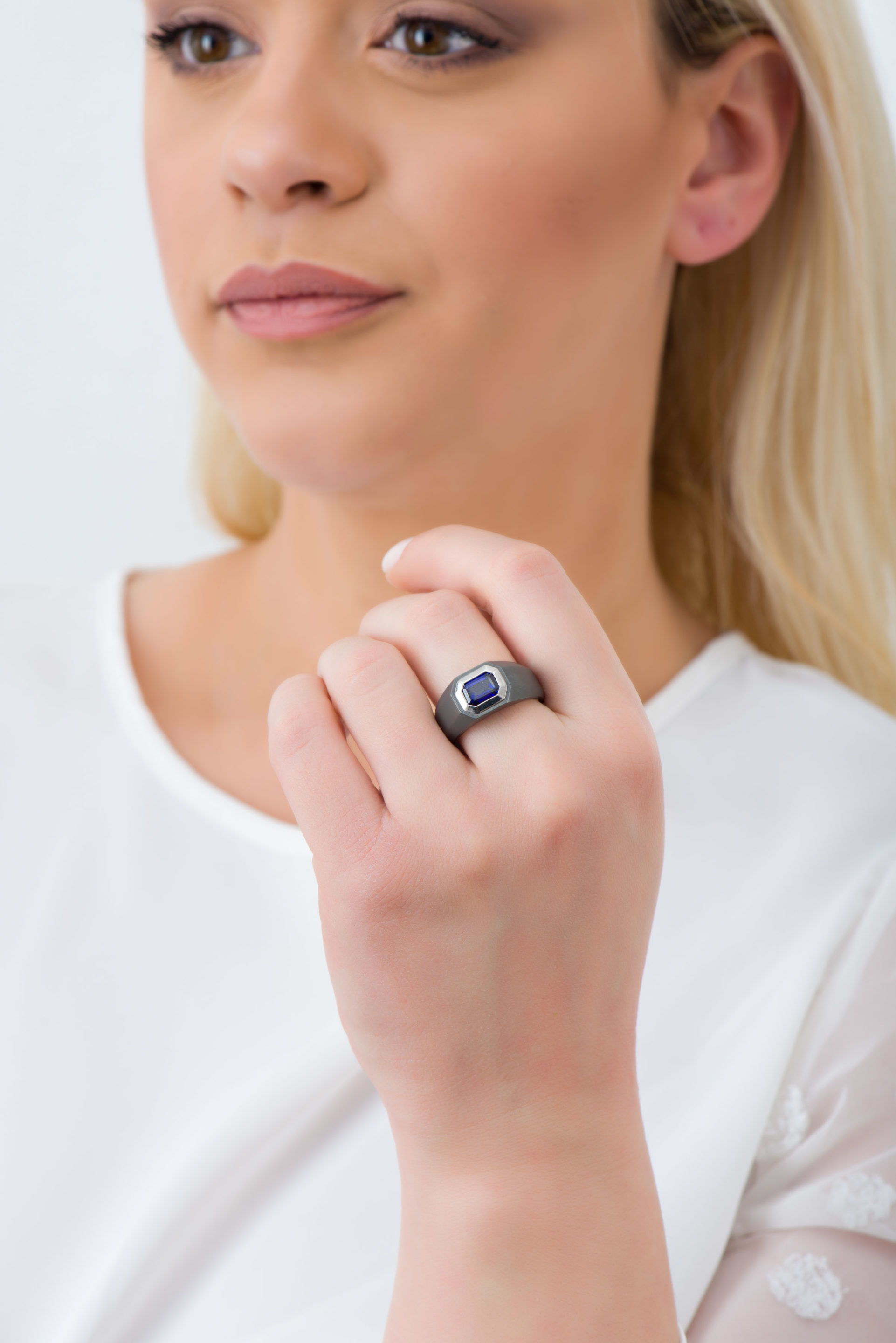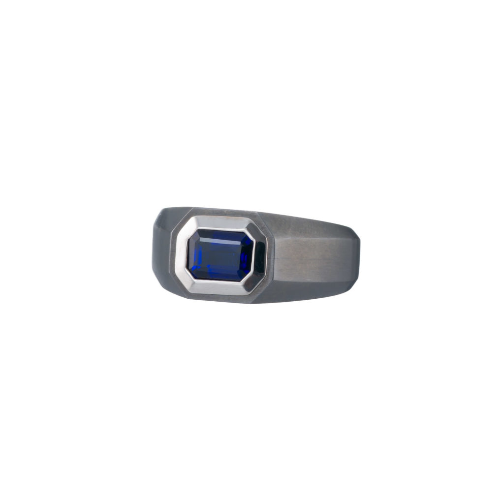 Greek Jewelry, This bold ring, in 18k White Gold and titanium features a flat top Sapphire.
