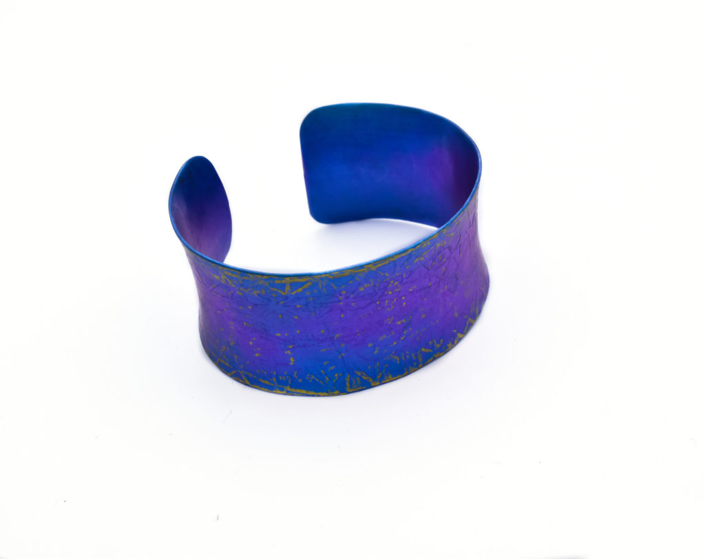 Greek Jewelry, An anodized titanium textured bracelet in blue and purple shades and edgy shape travels you to the universe.