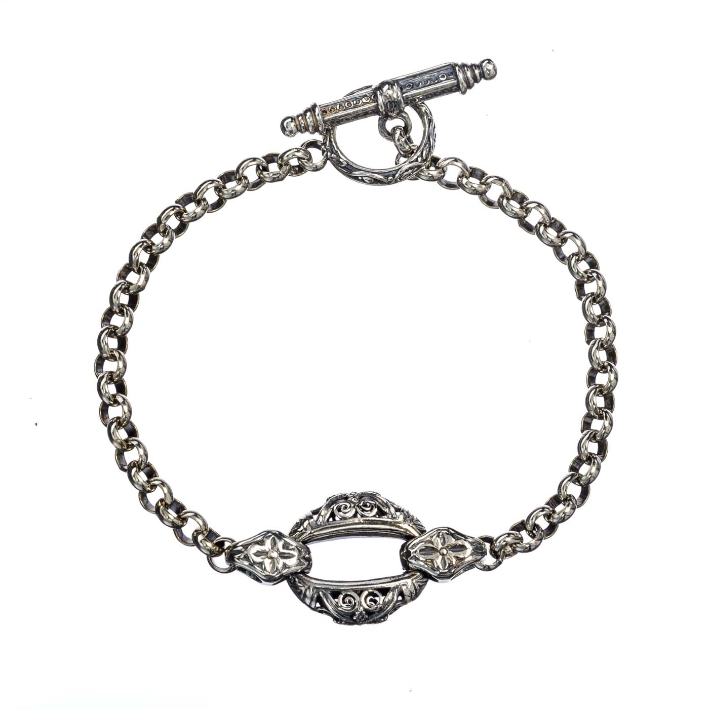 Handmade Byzantine Circle Link Chain Bracelet crafted from sterling silver 925. Features intricate Byzantine-style links and a secure toggle clasp for easy wear and timeless elegance.