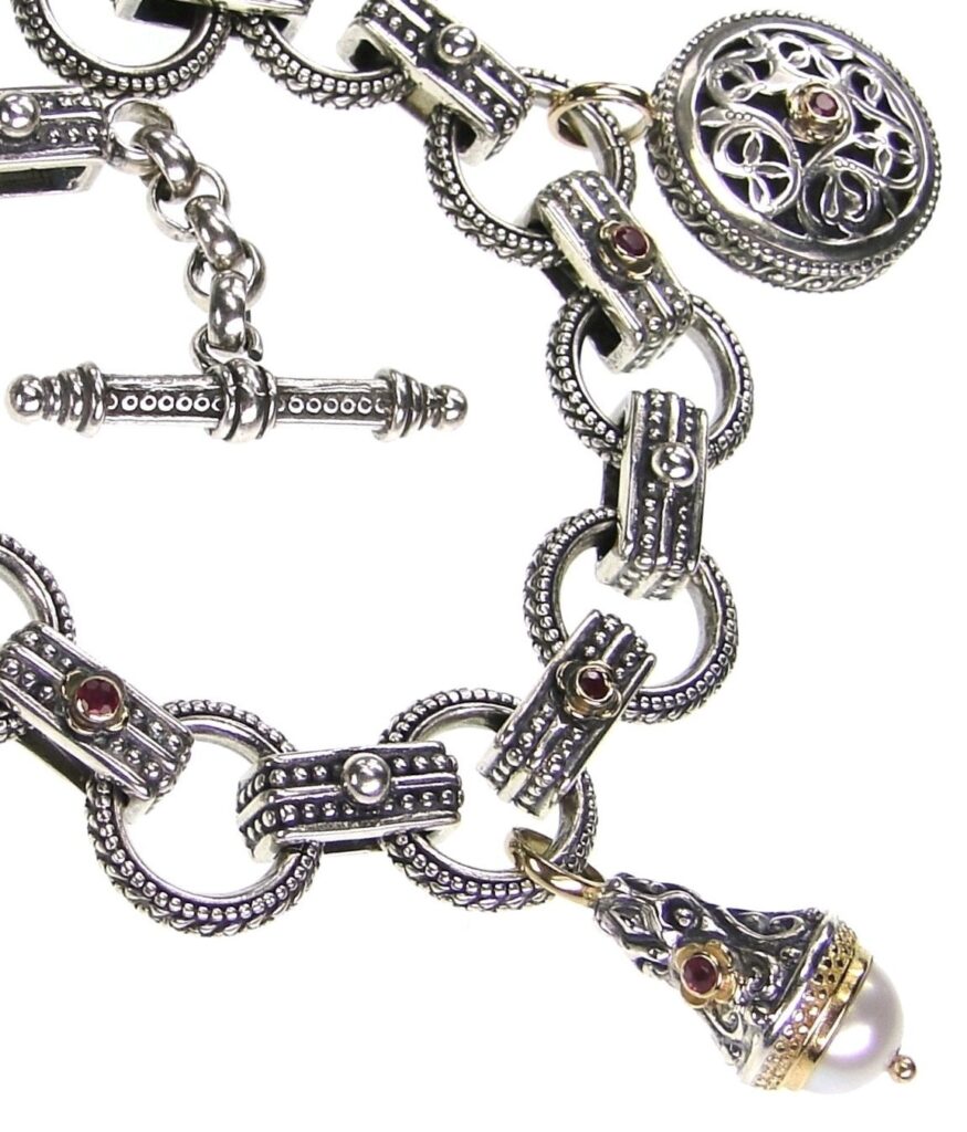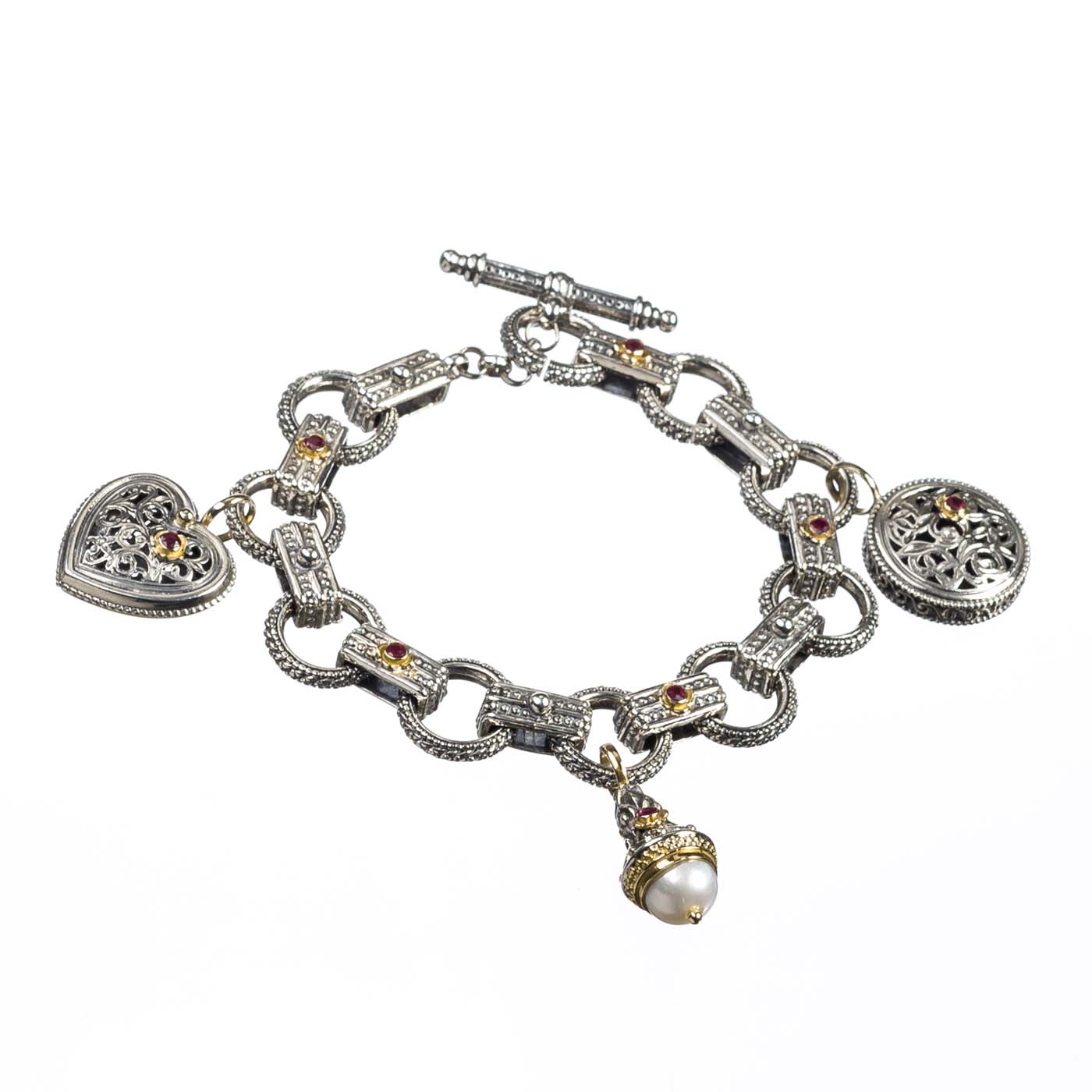 A classic sterling silver charm bracelet crafted with linked rings featuring genuine rubies and solid 18k gold accents. This elegant piece is enhanced with unique charms, combining silver with gold details, rubies, and pearls, all inspired by Byzantine artistry. A timeless accessory blending tradition with refined luxury.