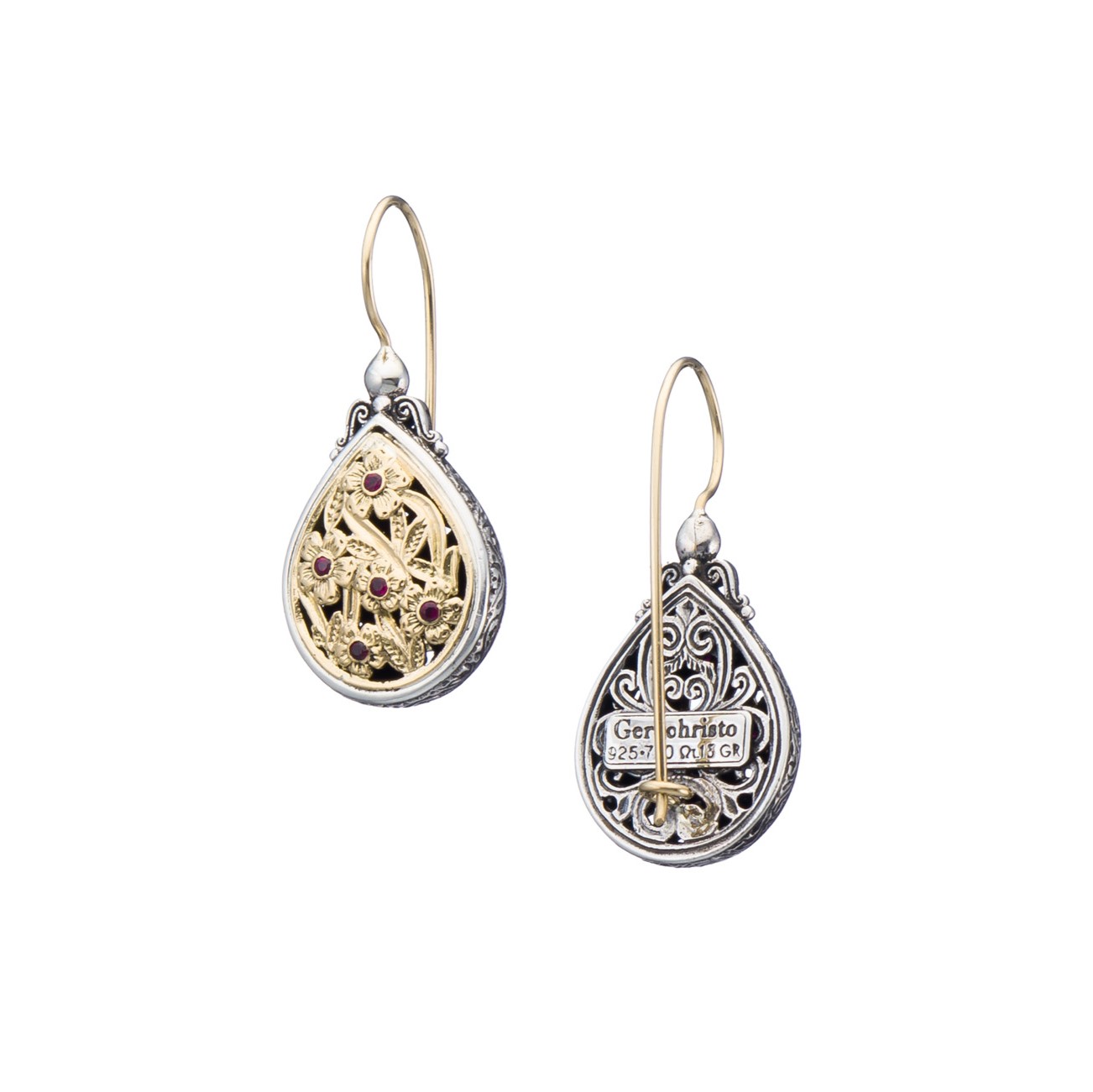 Teardrop Earrings in 18K Yellow Gold and Sterling Silver with Rubies