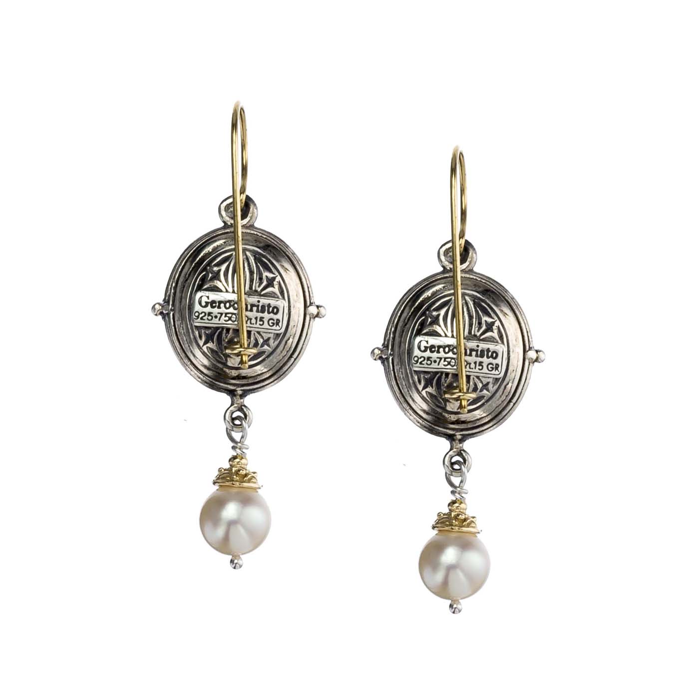Greek Jewelry, Byzantine Drop Earrings for Women’s 18k Yellow Gold and Sterling Silver 925 & semi-precious stones mobile freshwater pearls.
