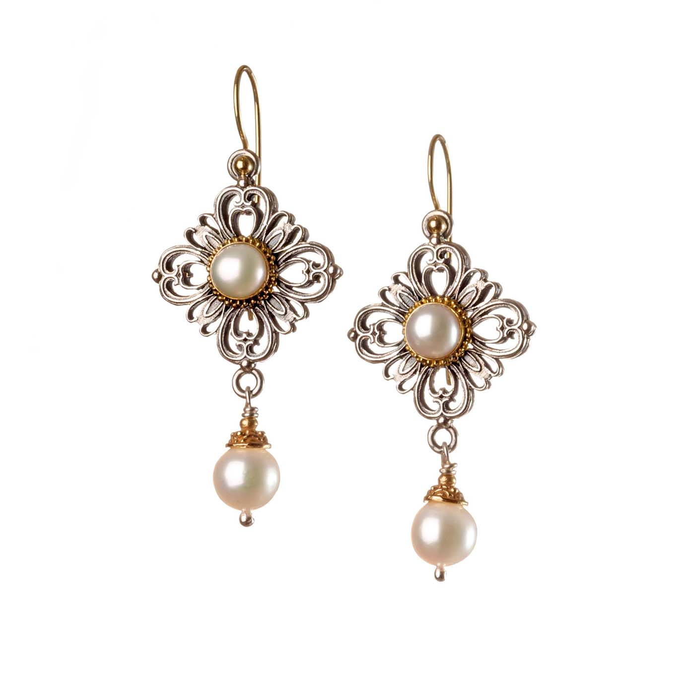 Greek Jewelry, Byzantine Drop Earrings for Women’s 18k Yellow Gold and Sterling Silver 925 & mobile freshwater pearls.