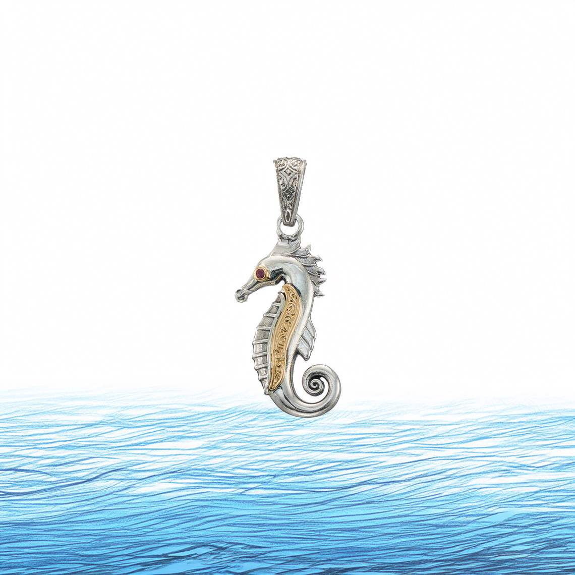 Sea Horse Medium Pendant in 18k Yellow Gold and Silver with ruby