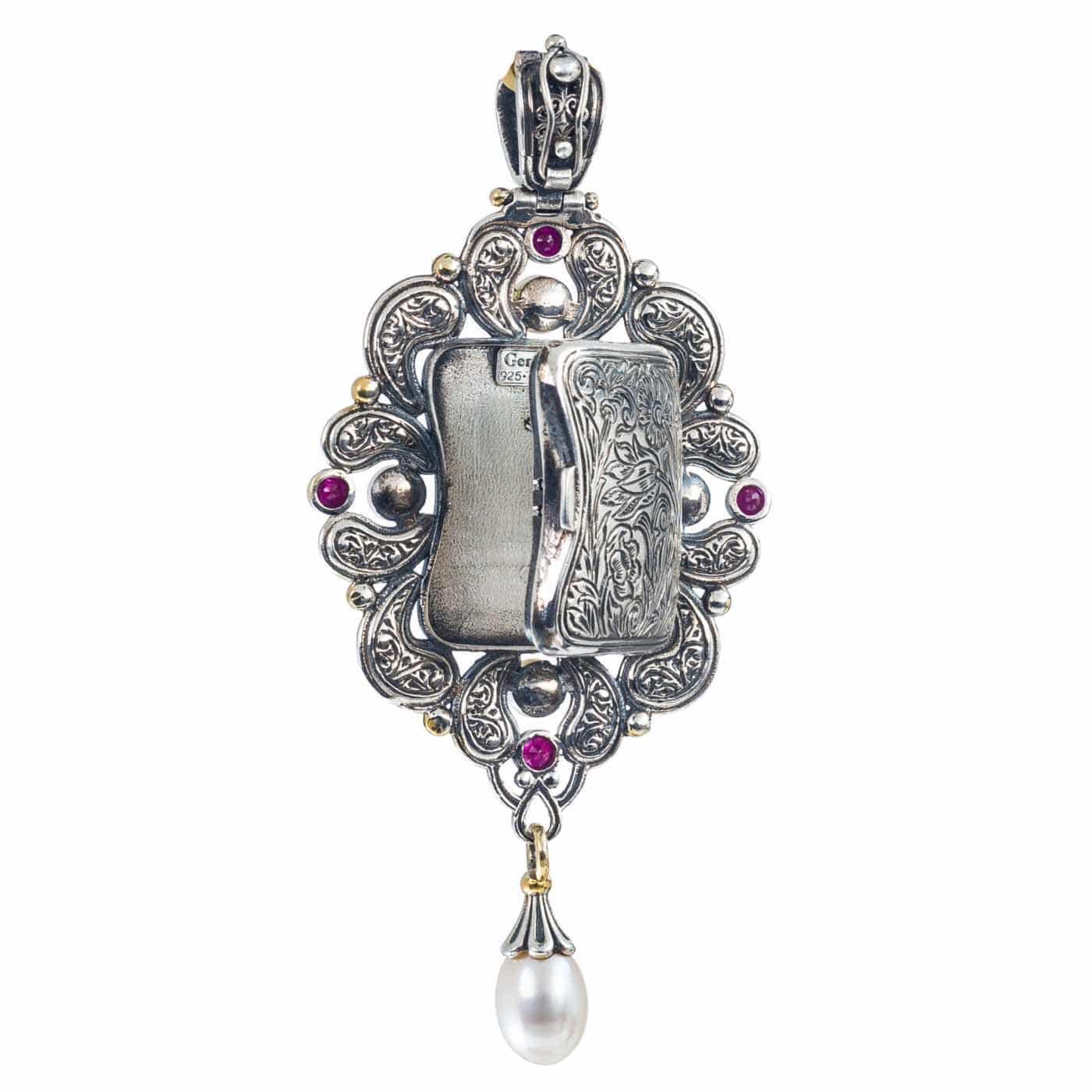 A filigree locket pendant in 18k yellow gold and sterling silver 925, featuring a pearl drop and delicate freshwater pearls and diamonds 0.36cts or rubies throughout.