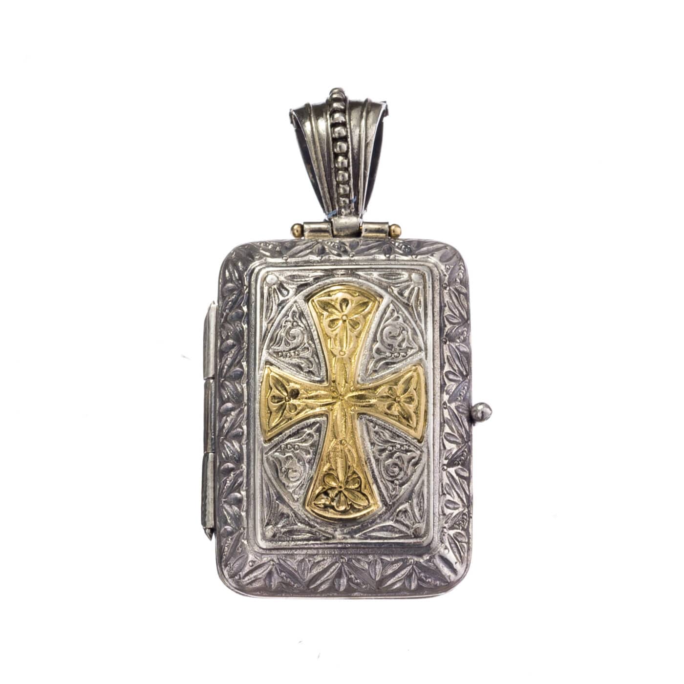Greek Jewelry, Engraved Rectangular Locket Pendant with Cross 18k Yellow Gold and Silver 925