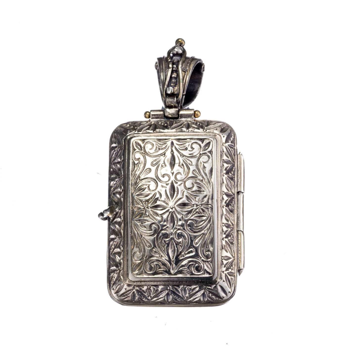 Engraved Rectangular Locket Pendant with Cross 18k Yellow Gold and Silver 925