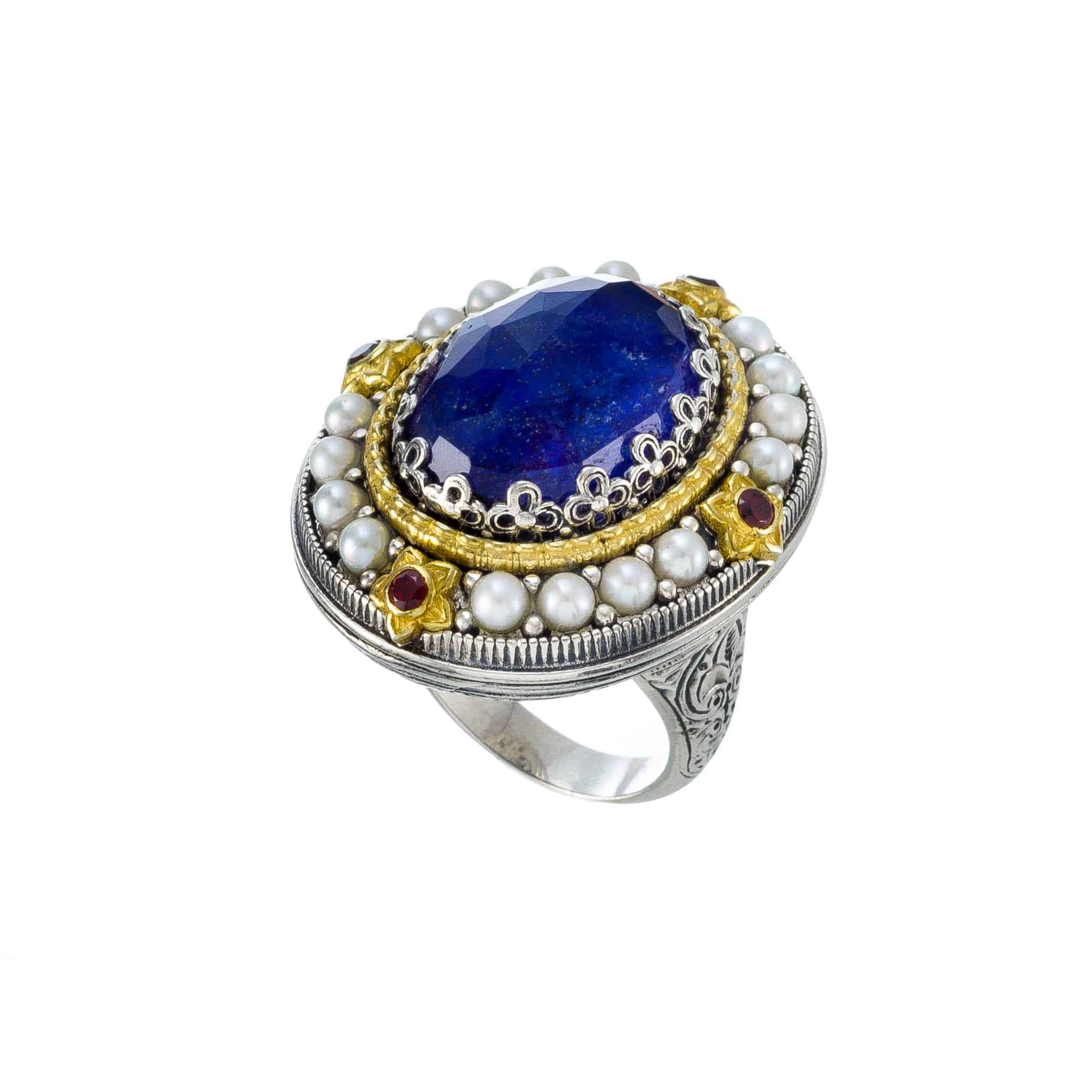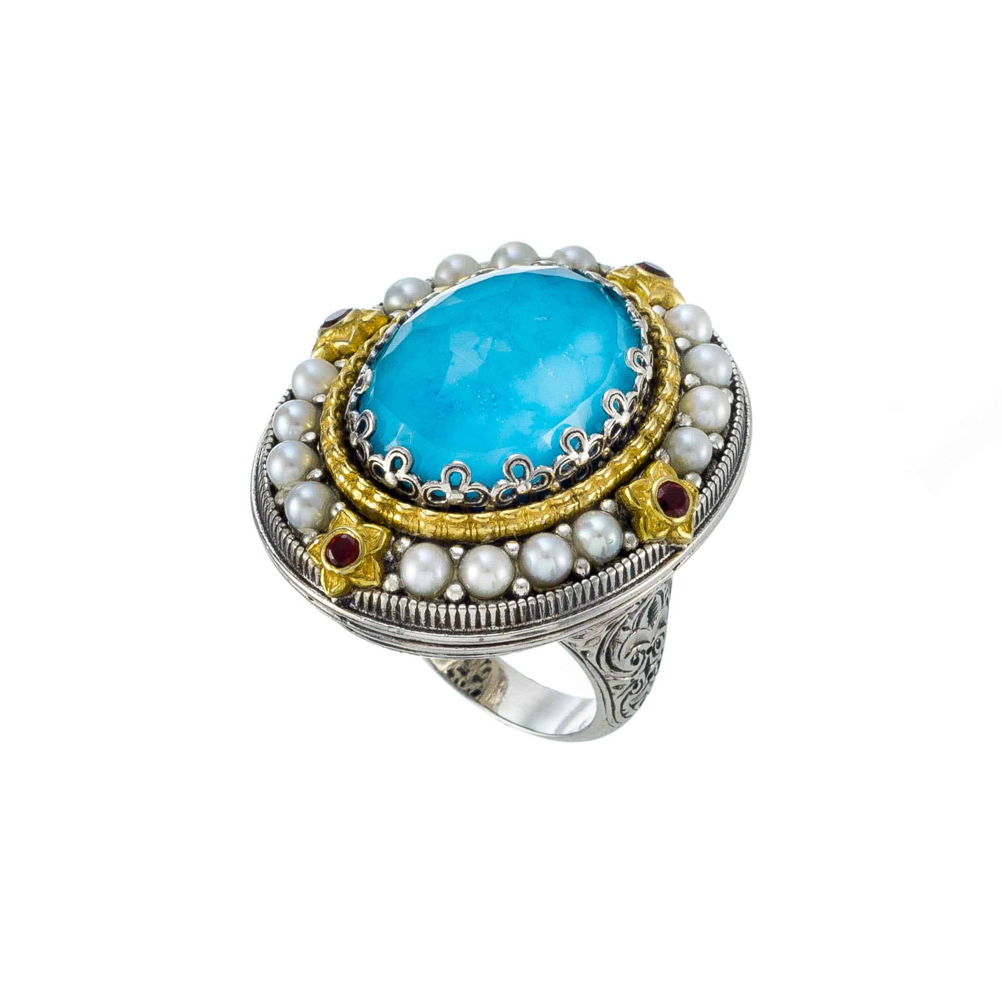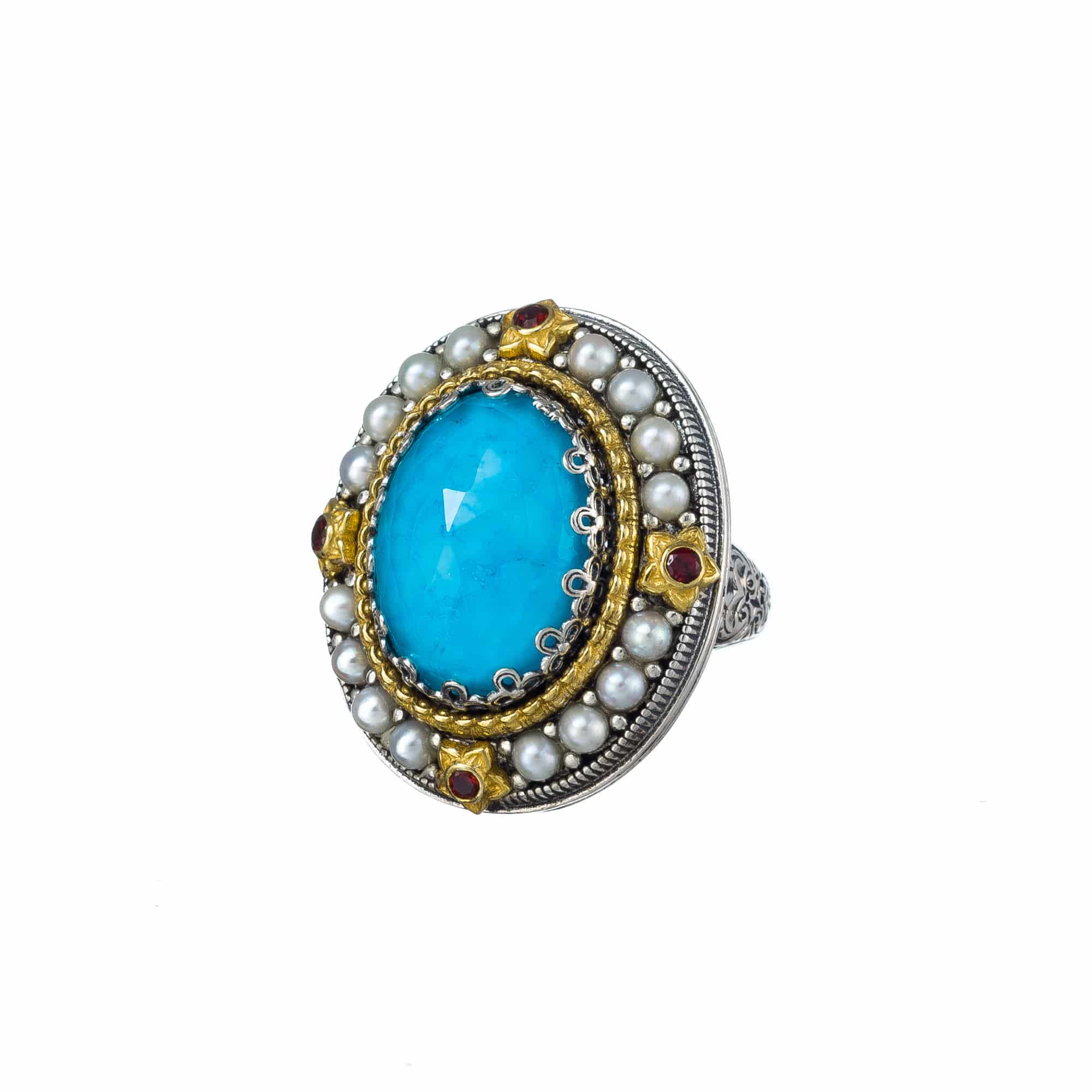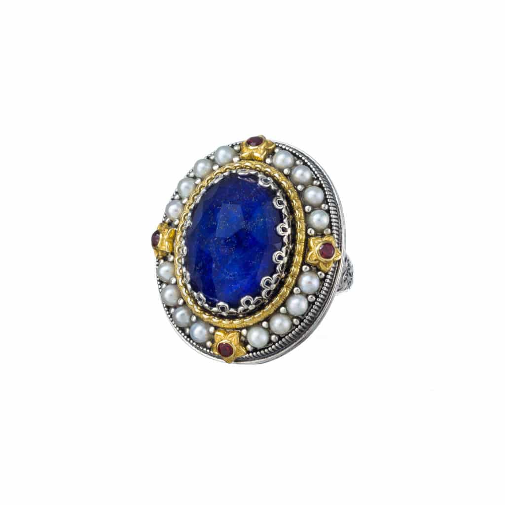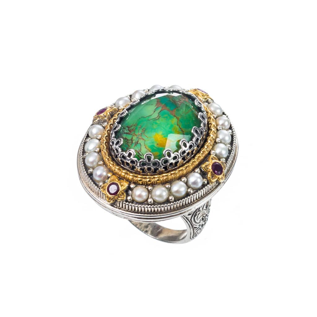 Greek Jewelry, Oval Large Color Ring in Sterling Silver 925 with Gold Plated parts