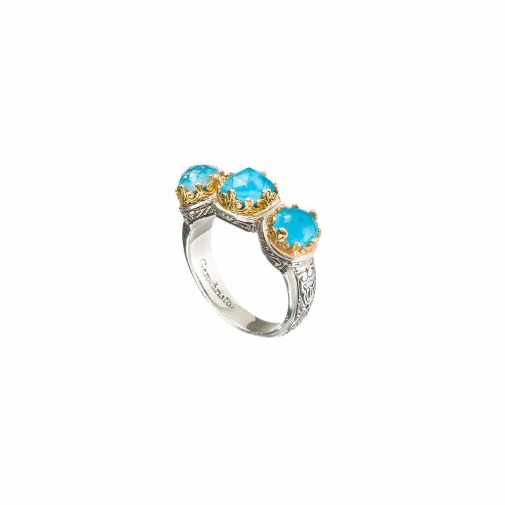 Greek Jewelry, Triple Stones Ring in k18 Yellow Gold and Sterling Silver 925